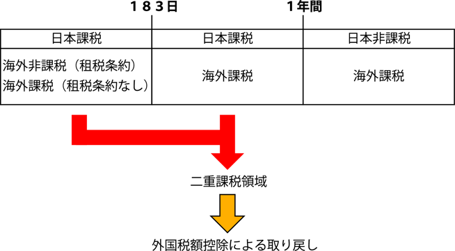 更に厄介なのは半年を超えて1年以内の予定で帰国する方のケースです。この方は日本の居住者として取り扱われるため、全世界所得が課税対象となります。その一方で出向先の国の税法や、租税条約の規定によりますが、通常半年を超える様な期間を海外で滞在する場合には、滞在期間中に受けとる給与の全額について(出向元法人の支払額も含め)、現地で納税する必要があります。
